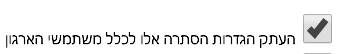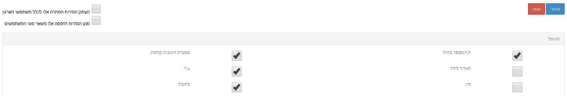 למנהלי מערכת במערכת ארגונית בלבד נתונה האופציה להסתיר שדות לשאר משתמשי הארגון. יש לסמן את השדות שרצויים להסתרה, ולסמן התיבה המופיעה בצד שמאל מעל פרטי המטופל: