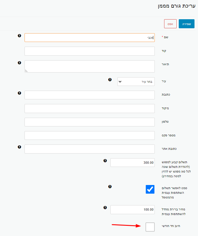 בעת עריכה או הוספה של גורם מממן ניתן לסמןו את השדה של חיוב חד חודשי :